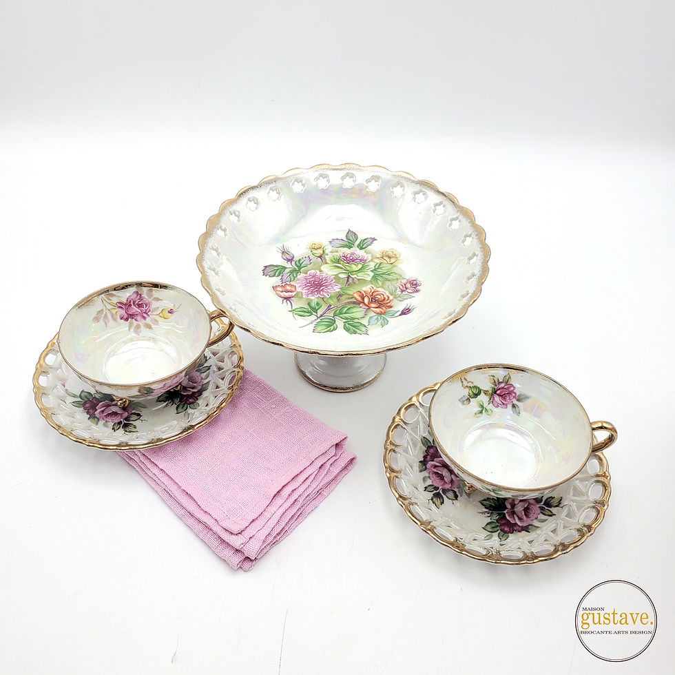 Beau modèle couleur jaune crème avec un joli motifs de fleurs et une bordure or sur la soucoupe et la tasse.